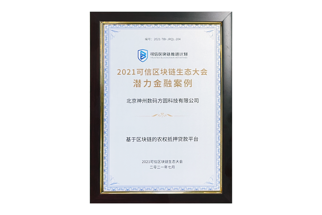 7月13日,由中国信息通信研究院、可信区块链推进计划主办的“2021可信区块链生态大会”在京举办,并隆重发布系列成果。神州信息子公司北京东升国际方圆科技有限公司(简称:神州方圆)推荐的“基于区块链的农权抵押贷款平台”荣获十大金融应用高潜力案例,为“区块链+农业”落地带来示范效应。