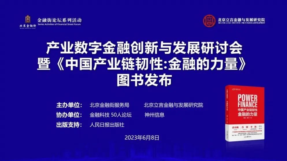 6月8日,由北京金融街服务局和北京立言金融与发展研究院联合主办,金融科技50人论坛、神州信息协办,人民日报出版社出版支持的金融街论坛系列活动之产业数字金融创新与发展研讨会暨《中国产业链韧性:金融的力量》图书发布在京成功举办。来自政产学研的专家学者以及部分图书作者围绕如何推动“科技—产业—金融”良性循环,把科技创新、产业振兴和金融发展有机结合起来等重要议题展开讨论。本次会议也是立言首都金融论坛第三十五期会议。